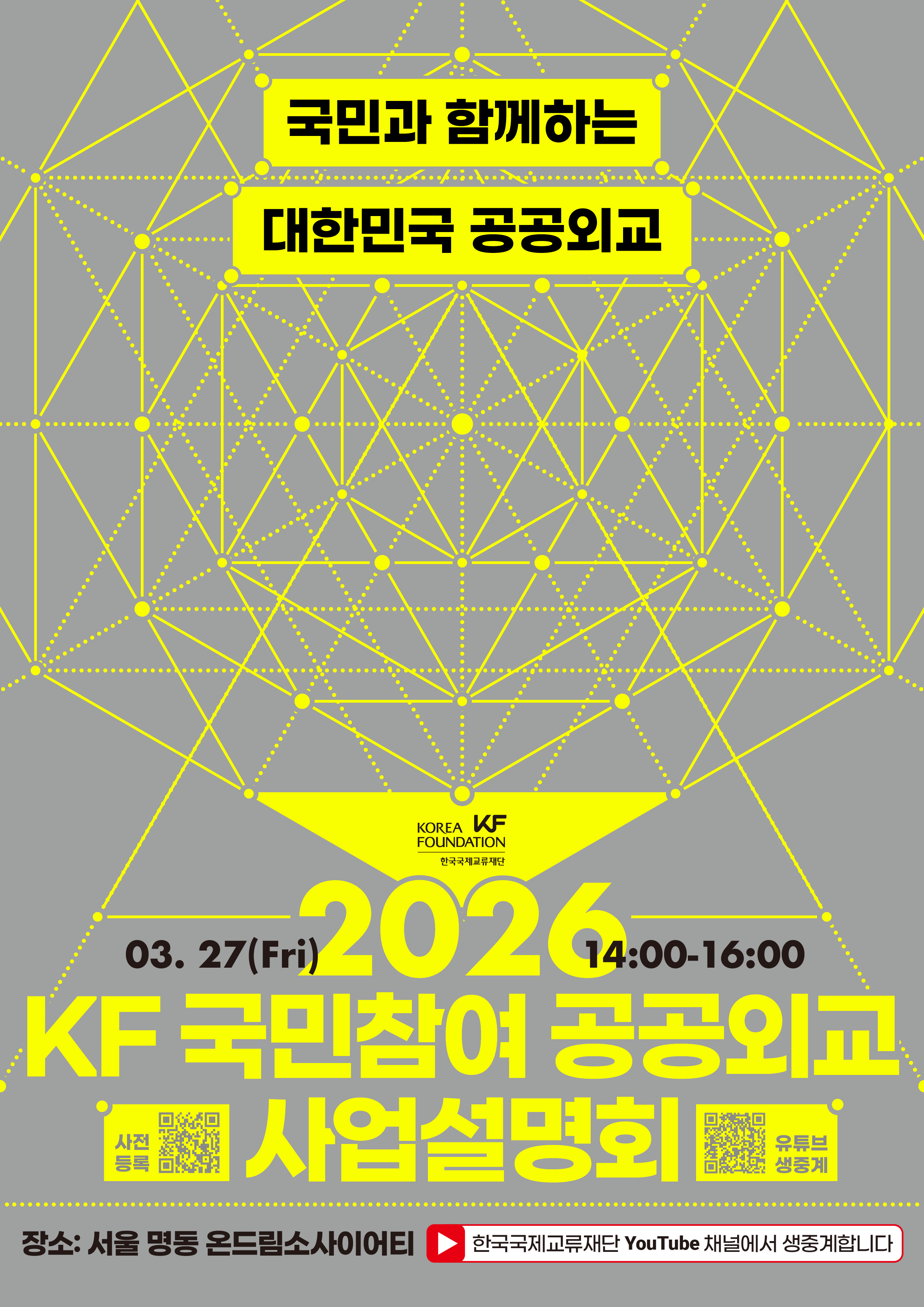 한국국제교류재단(KF)은 공공외교에 대한 우리 국민의 관심과 이해를 높이고자「KF 국민참여 공공외교 사업설명회」를 개최합니다. 우리 국민이 참여할수 있는 KF 사업들에 대한 설명을 들을 수 있는 자리입니다. 많은 관심 부탁드립니다.